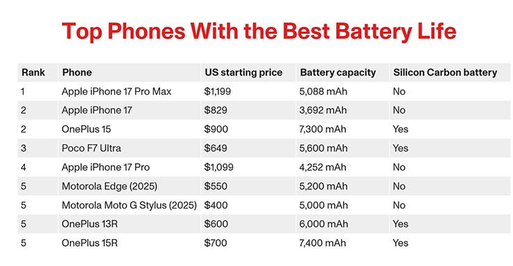 Đáng ngạc nhiên khi dòng iPhone 17 của Apple đã giành chiến thắng trong bài kiểm tra này. Cụ thể, iPhone 17 Pro Max đứng đầu bảng xếp hạng về thời lượng pin, trong khi iPhone 17 bản tiêu chuẩn và OnePlus 15 đồng hạng ở vị trí thứ hai.