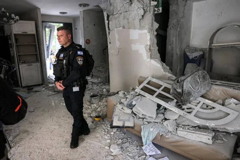Cảnh sát Israel kiểm tra một tòa nhà bị hư hại sau vụ tấn công bằng UAV của Iran tại thành phố Rishon LeZion (miền trung Israel) ngày 16-3. Ảnh: AFP