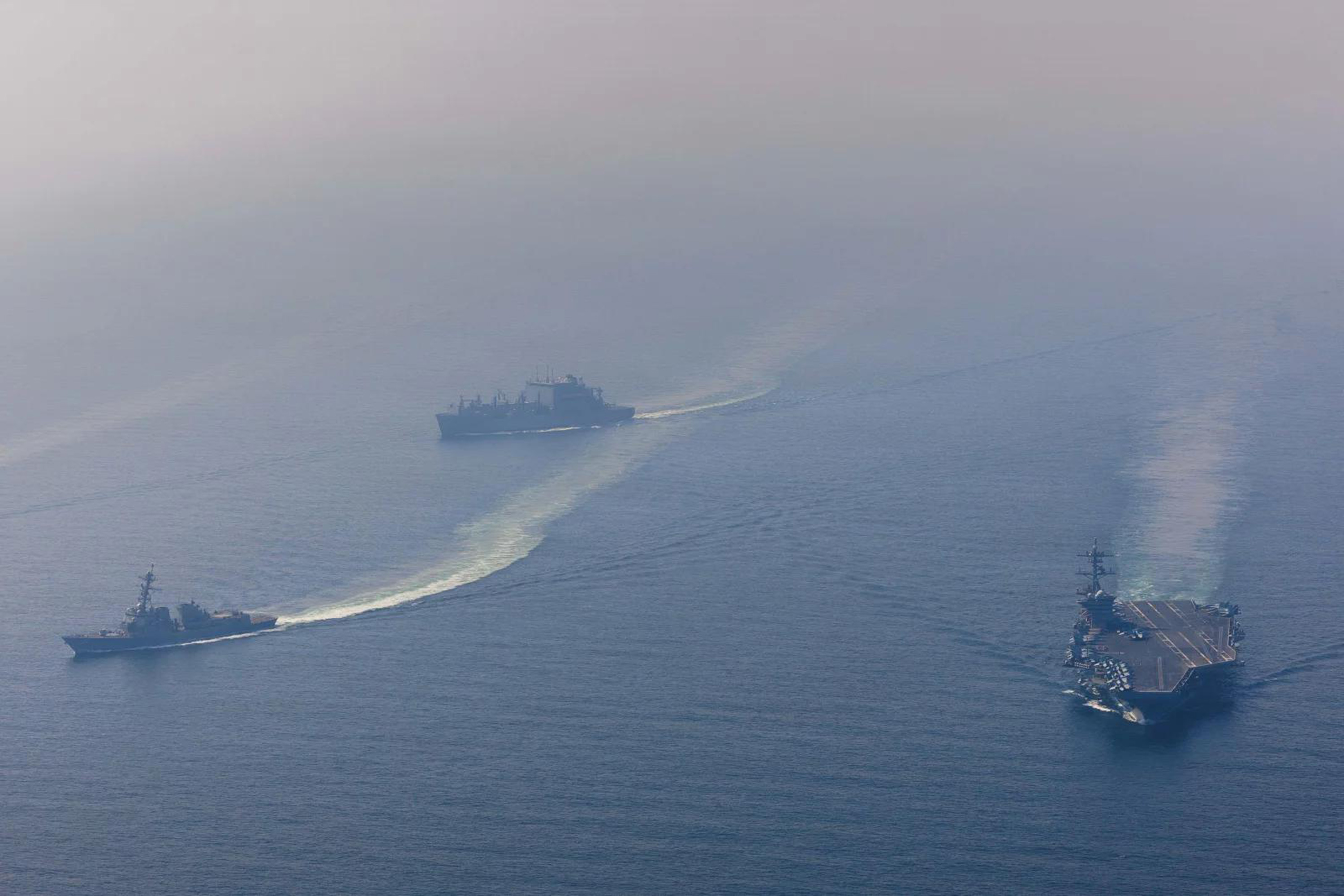 Tàu sân bay USS Abraham Lincoln của Hải quân Mỹ di chuyển song song với tàu khu trục mang tên lửa dẫn đường USS Frank E. Petersen Jr. và tàu chở hàng USNS Carl Brashear trên Biển Arab (ẢNH: Jesse Monford/Hải quân Hoa Kỳ qua Getty Images)
