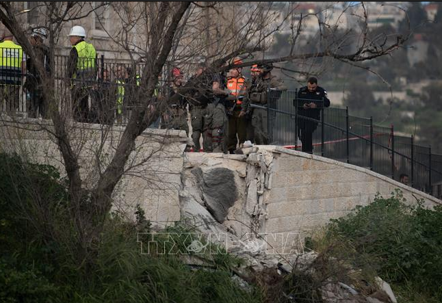 Bức tường bị hư hại do trúng tên lửa tại Jerusalem ngày 20/3/2026. Ảnh: THX/TTXVN