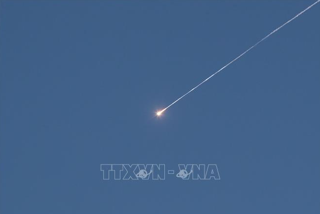 Mảnh vỡ tên lửa rơi xuống khi hệ thống phòng không của Israel đánh chặn tên lửa bay qua bầu trời Jerusalem ngày 17/3/2026. Ảnh: THX/TTXVN