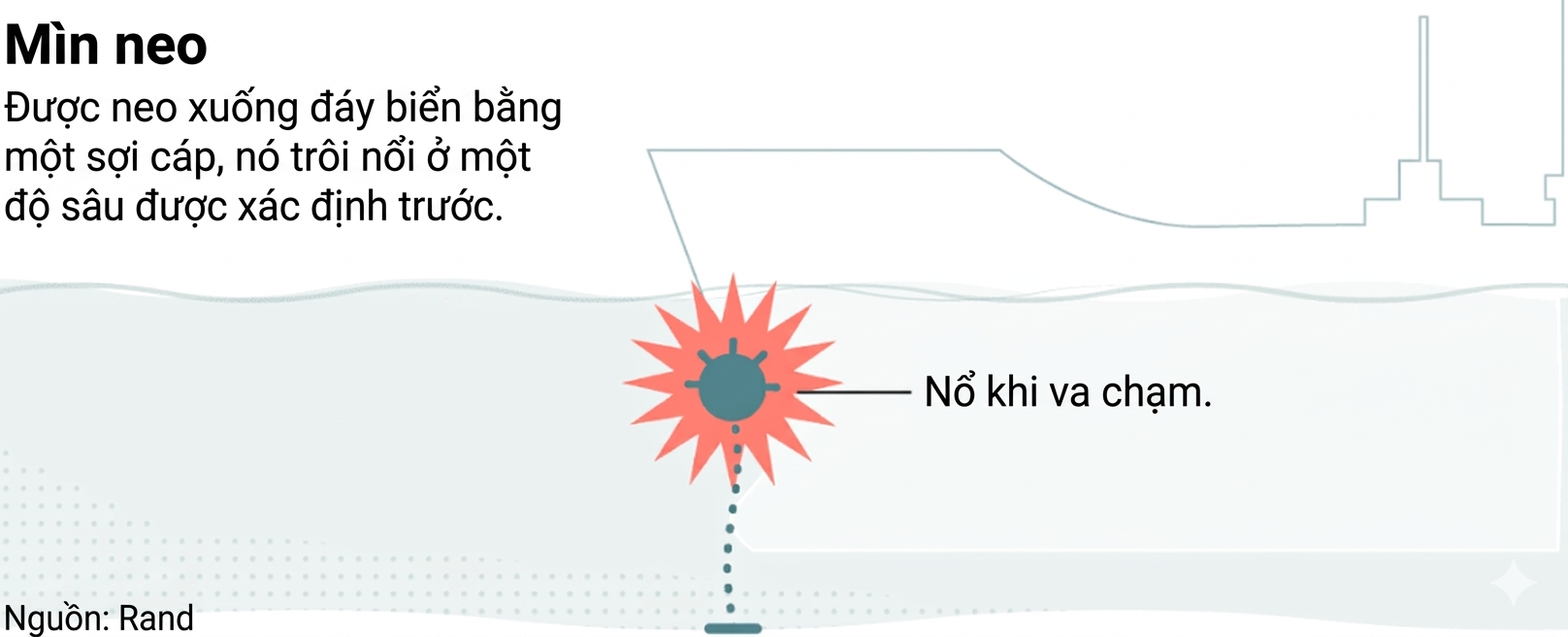 Phổ biến nhất là thủy lôi neo - đầu nổ được giữ lơ lửng dưới mặt nước bằng một sợi xích nối với mỏ neo nặng dưới đáy biển.