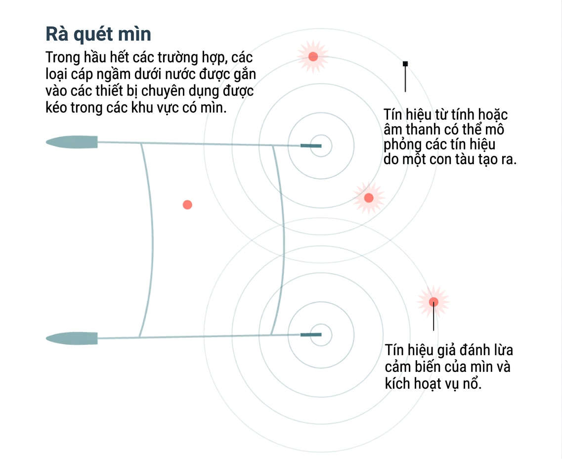 Một phương pháp khác là quét mìn (minesweeping) – mô phỏng tín hiệu từ trường, âm thanh hoặc áp lực của tàu thật nhằm kích nổ thủy lôi từ xa. Cách này có thể nhanh hơn việc tìm từng quả mìn, nhưng không phải lúc nào cũng hiệu quả, khiến nguy cơ còn sót lại mìn chưa nổ dưới nước vẫn khá cao.