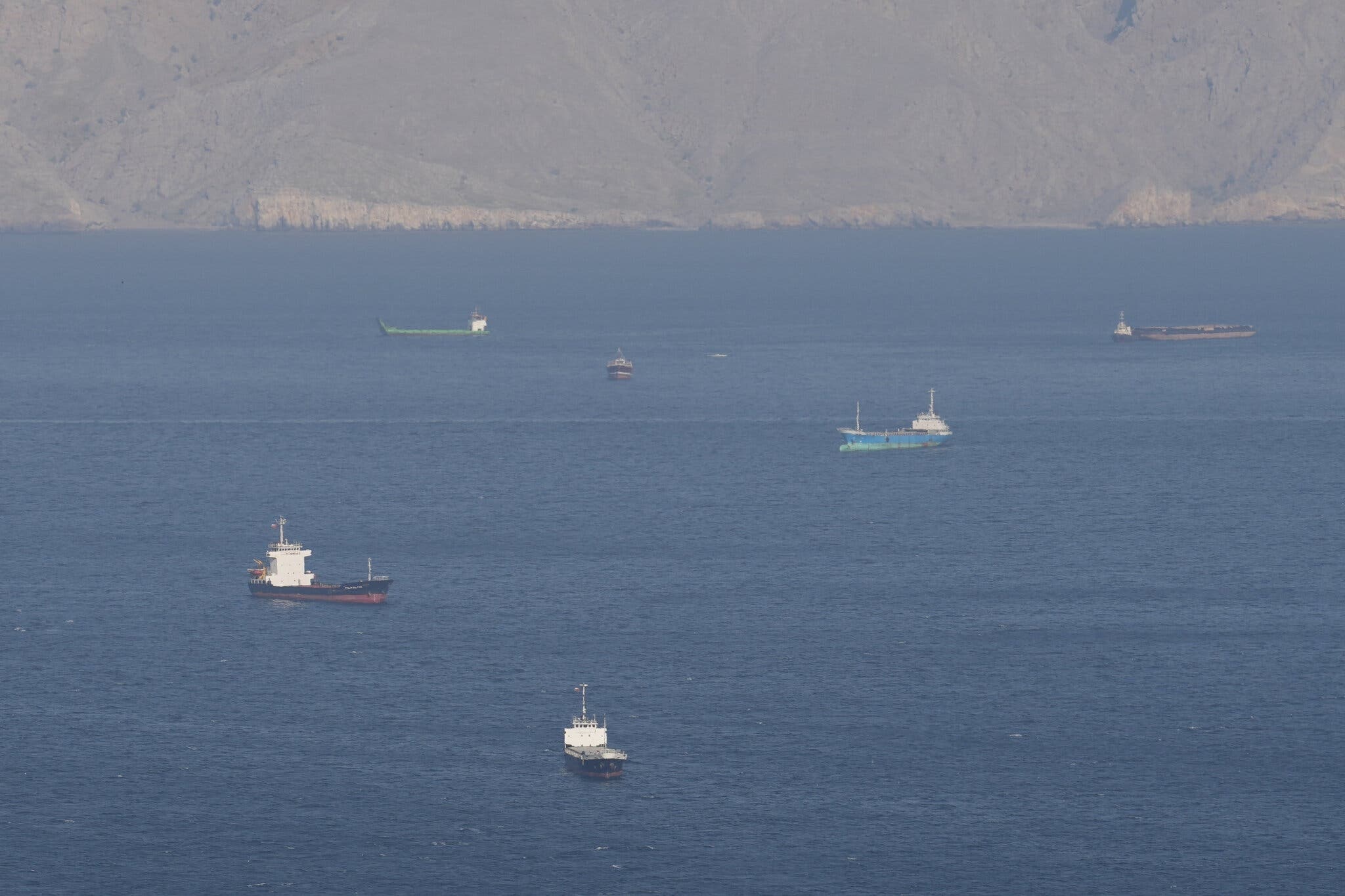 Tàu thuyền đi qua eo biển Hormuz nhìn từ phía Oman ngày 18/4. Ảnh: Reuters