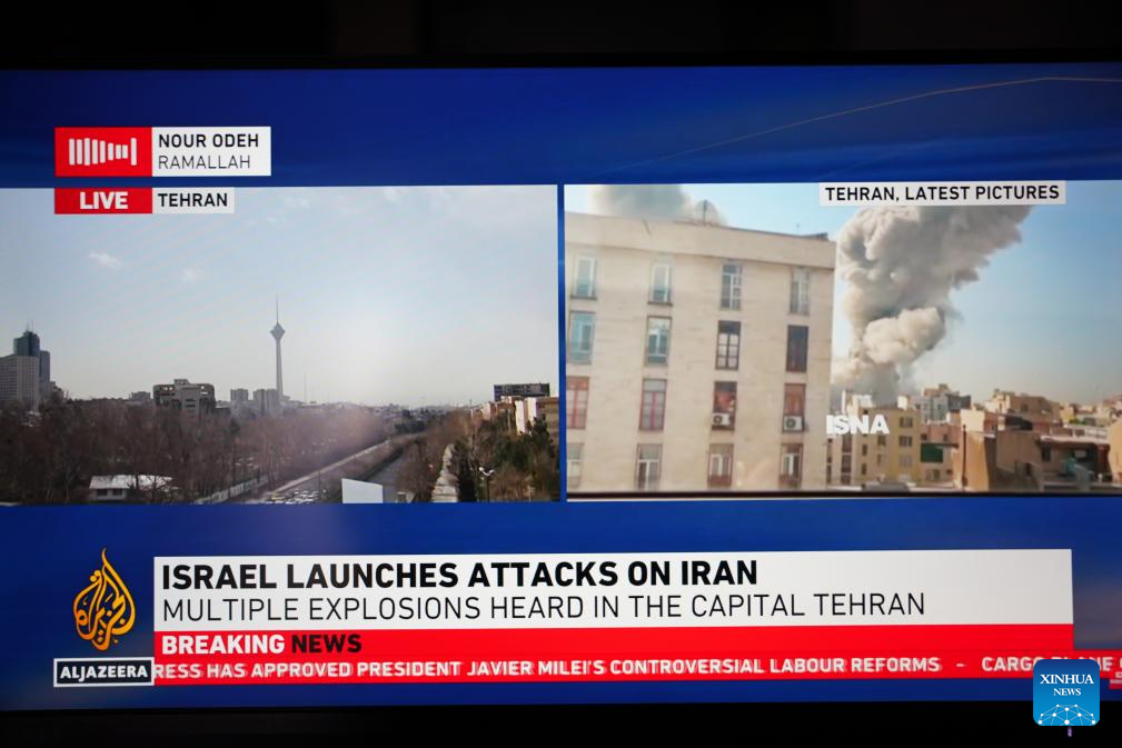 Kênh Al Jazeera đưa thông tin về vụ tấn công của Israel nhằm vào Iran. Ảnh: XINHUA/AL JAZEERA
