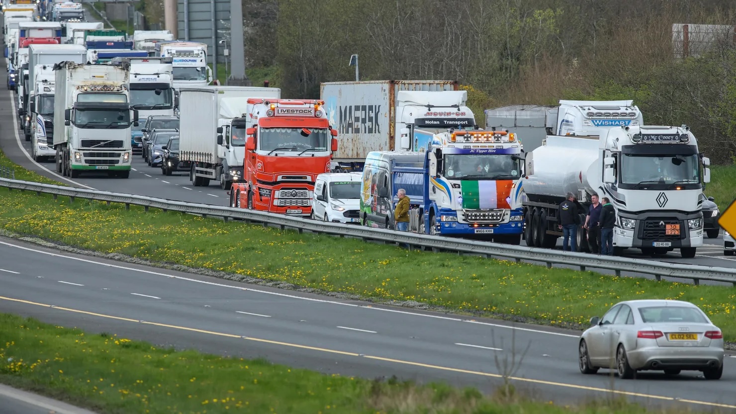 Người biểu tình phản đối giá nhiên liệu đã chặn đường cao tốc bên ngoài Dundalk, Ireland khi các cuộc biểu tình tiếp tục ngày thứ ba liên tiếp chống lại giá nhiên liệu tăng cao do cuộc khủng hoảng Trung Đông vào ngày 9/4/2026. Ảnh: Getty Images