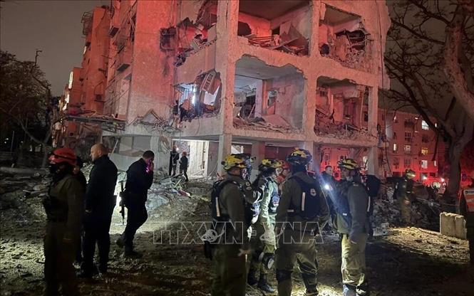 Các lực lượng ứng cứu khẩn cấp tại hiện trường vụ tấn công bằng tên lửa đạn đạo của Iran ở thành phố Arad, miền Nam Israel tối 21/3/2026. Ảnh: TTXVN phát