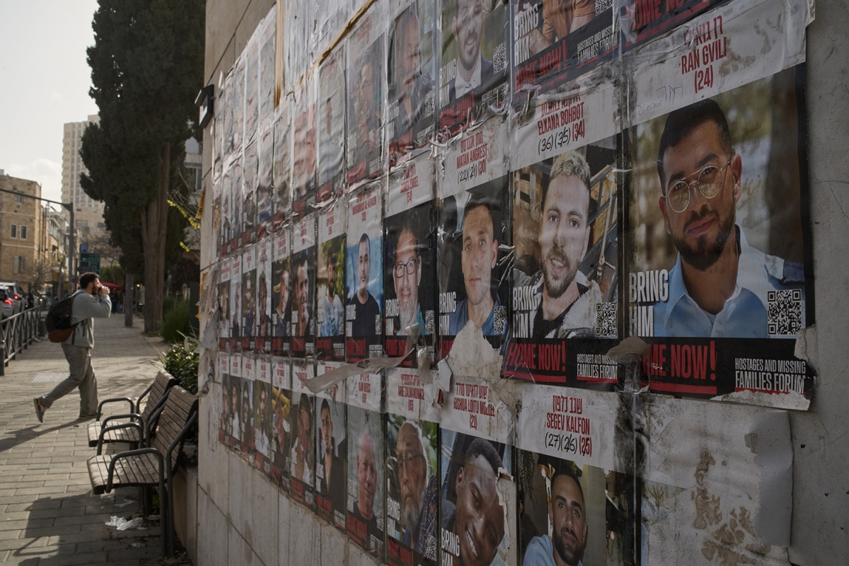 Ảnh các con tin bị Hamas bắt cóc và giam giữ, được treo trên một tuyến phố ở Jerusalem, ngày 27/1/2026. Ảnh: AP