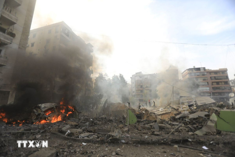 Tòa nhà bị phá hủy sau cuộc không kích của Israel tại Beirut, Liban. (Ảnh: THX/TTXVN)