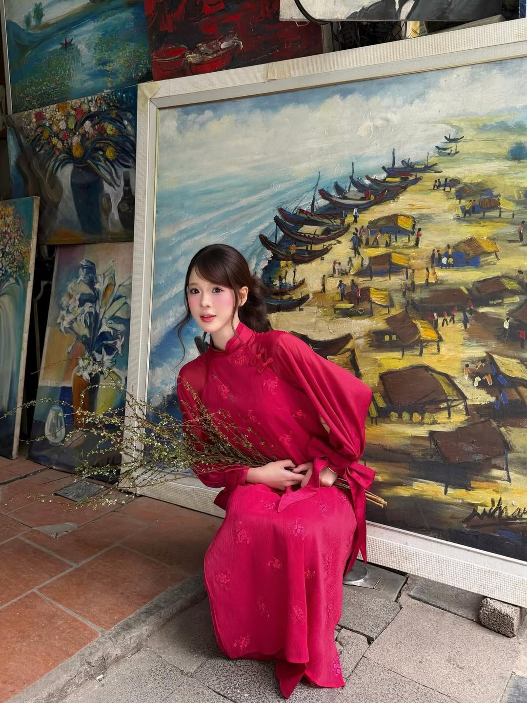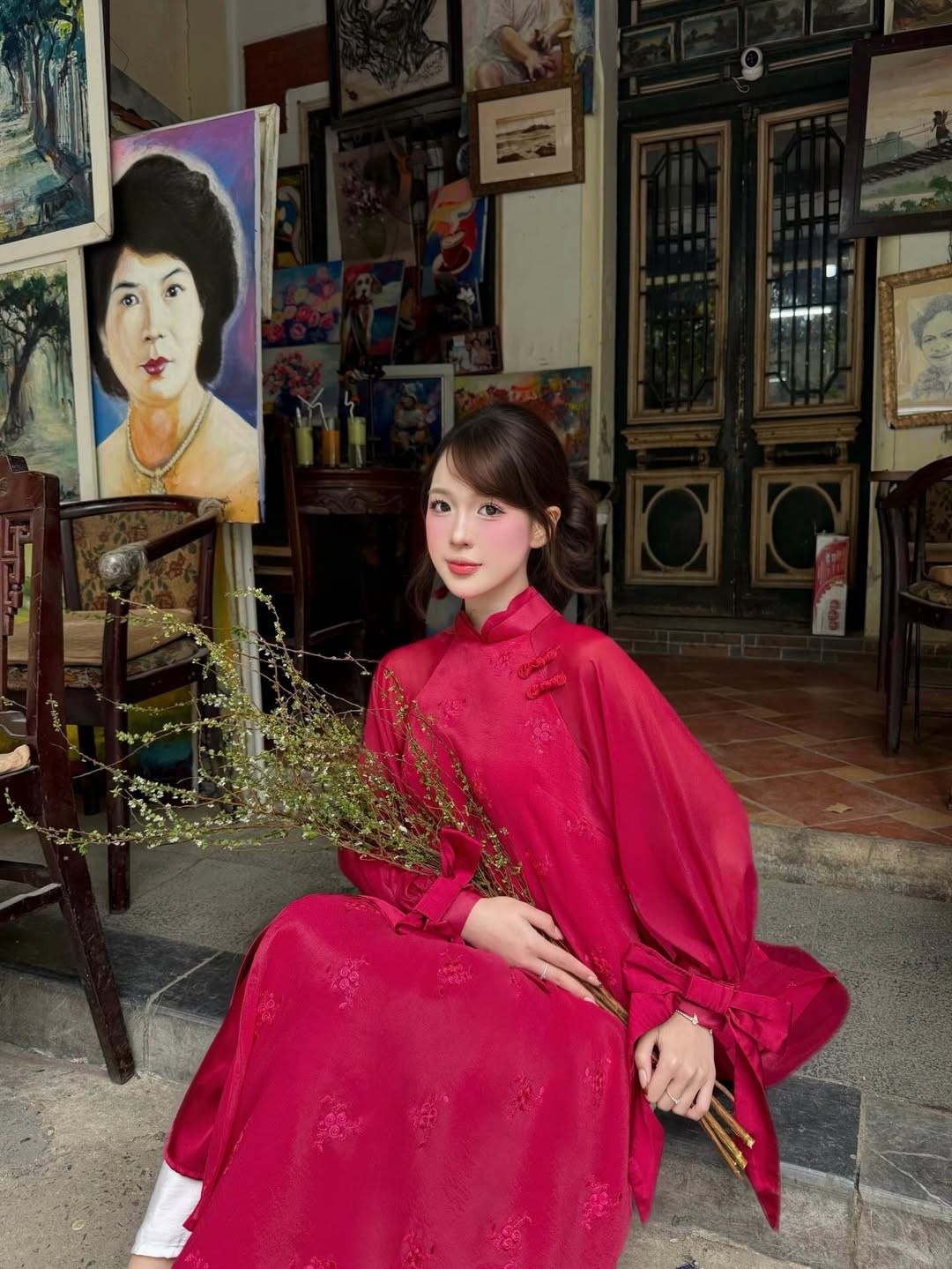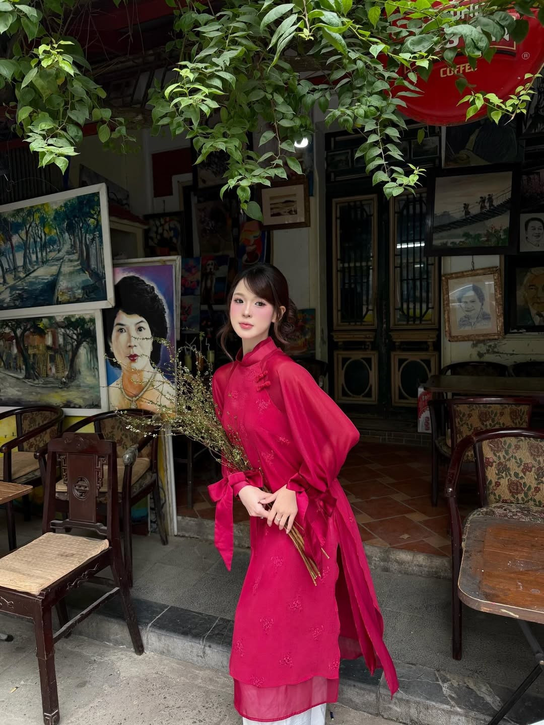 Wyn Anh chọn cho mình bộ áo dài mang sắc đỏ rực rỡ - biểu tượng của sự may mắn và thịnh vượng trong dịp Tết đến xuân về. (Ảnh: IGNV)