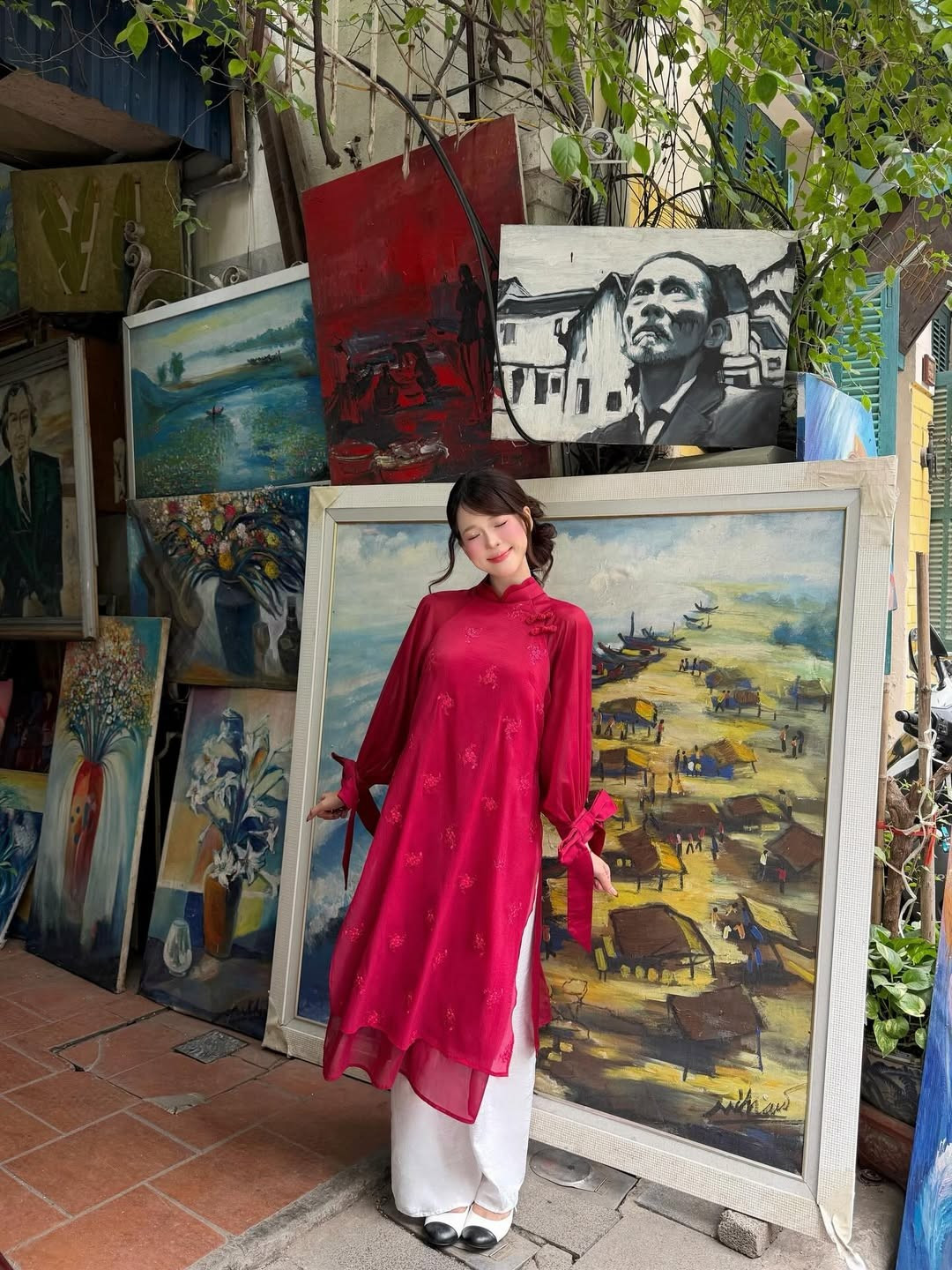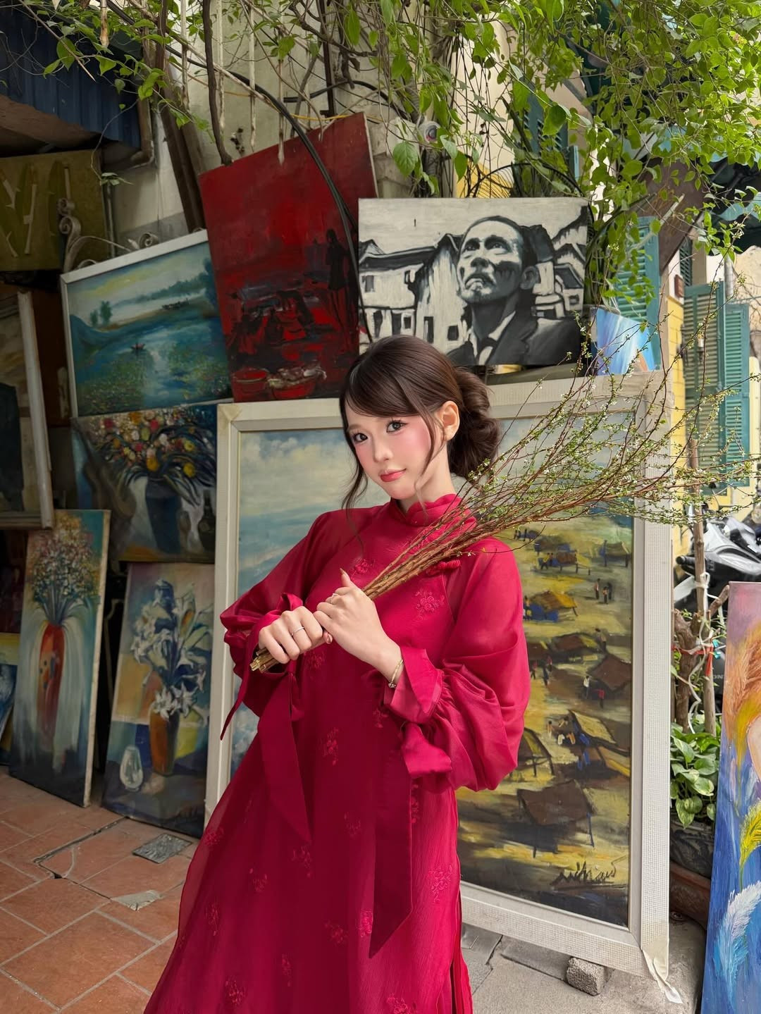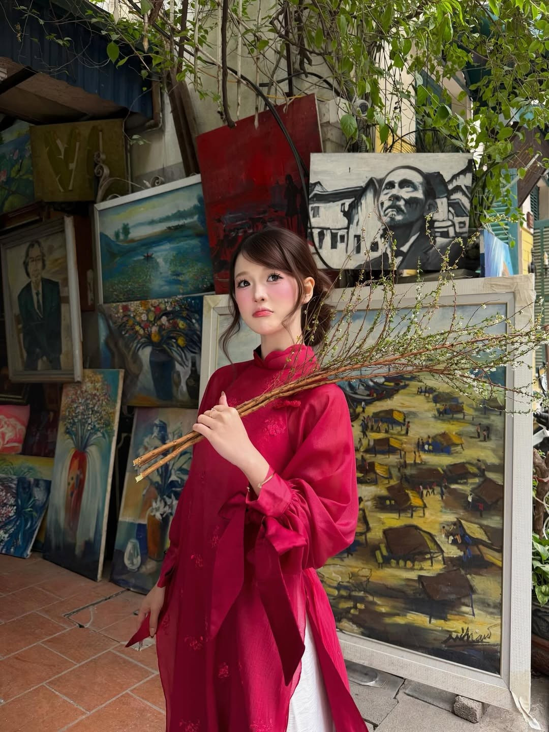 Sự kết hợp giữa tà áo dài đỏ nổi bật cùng những cành tuyết mai trắng muốt - loài hoa đặc trưng của mùa xuân miền Bắc - đã tạo nên một tổng thể vô cùng hài hòa và đậm chất thơ. (Ảnh: IGNV)