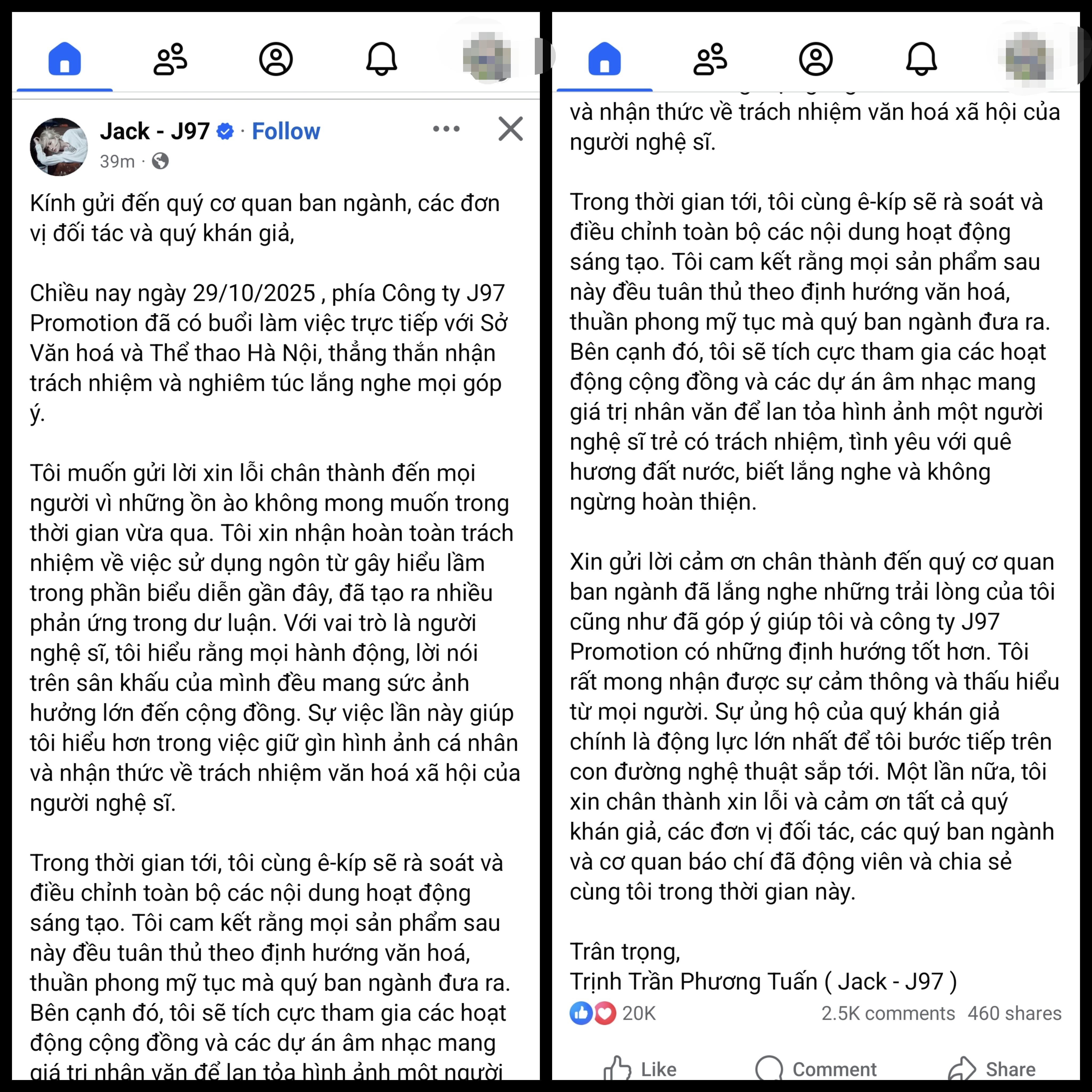 Khuya 29/10, ca sĩ Jack - J97 (Trịnh Trần Phương Tuấn) đã đăng tải một bài viết dài trên trang Facebook cá nhân, chính thức gửi lời xin lỗi sau ồn ào liên quan đến ca từ bị cho là phản cảm trong một phần trình diễn gần đây. Chỉ sau 39 phút, bài đăng đã thu hút hơn 20.000 lượt thích và thả tim, cùng hàng nghìn bình luận, chia sẻ từ cộng đồng mạng.