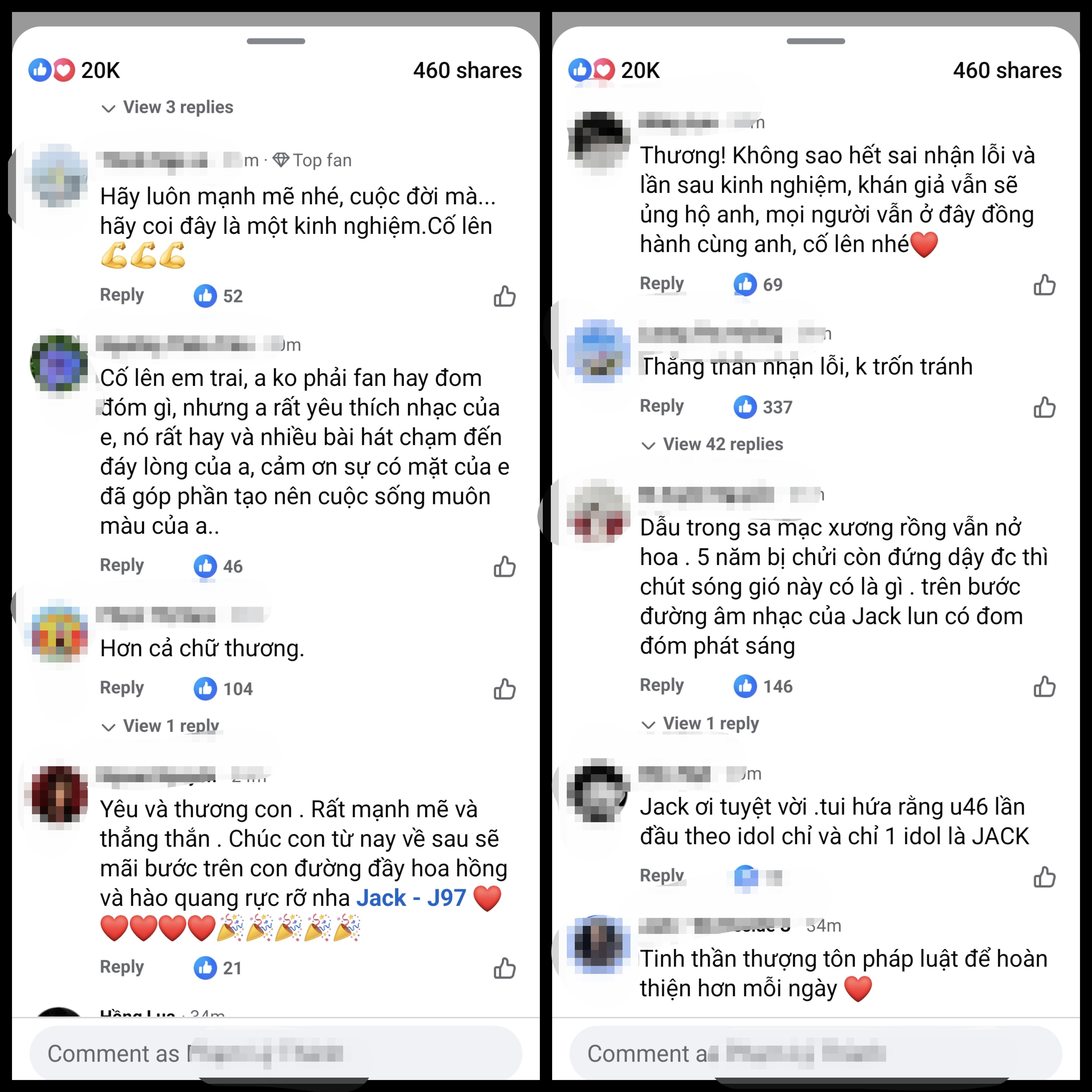 Nhiều người còn gửi lời khích lệ tinh tế. M.Xuyên Nguyễn bình luận: “Dẫu trong sa mạc xương rồng vẫn nở hoa. 5 năm bị chửi còn đứng dậy được thì chút sóng gió này có là gì. Trên bước đường âm nhạc của Jack luôn có đóm đốm phát sáng”.