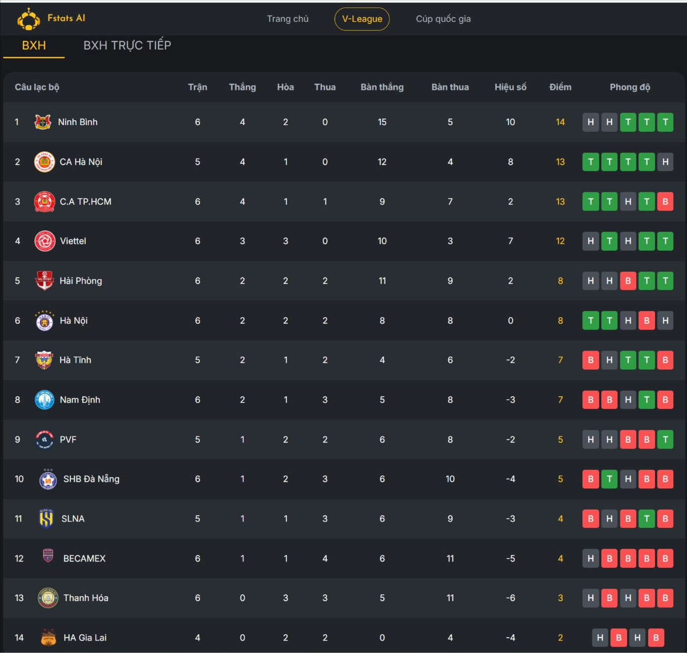 report BXH cập nhật LPBank V.League 2025/26