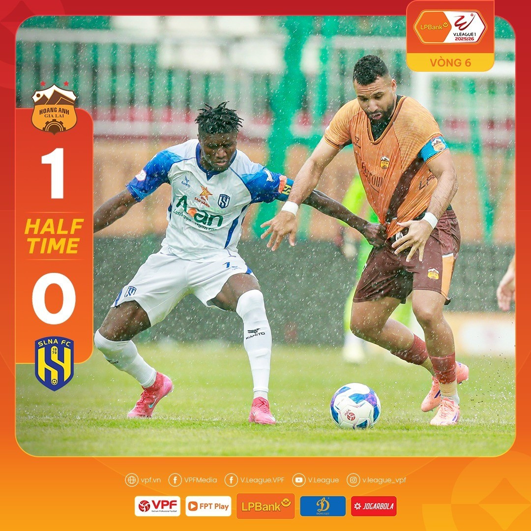Phút 1: Trọng tài Mai Xuân Hùng đã nổi hồi còi khai cuộc, bắt đầu trận đấu thuộc vòng 6 LPBank V.League 2025/26 giữa đội đang đứng cuối BXH HAGL và SLNA.