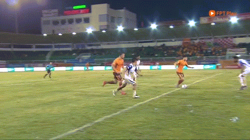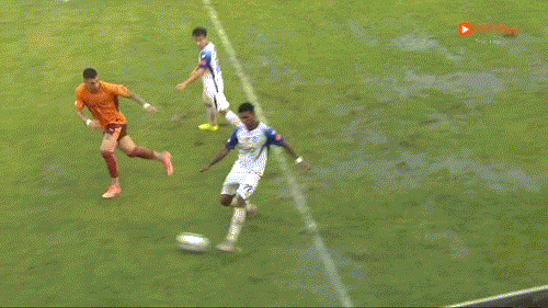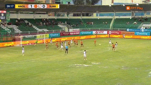 Phút 45+1: SLNA đang rất nỗ lực để có bàn gỡ trước giờ nghỉ giải lao, nhưng mặt sân xấu khiến họ, và cả HAGL, gặp khó khăn trong các pha phối hợp.