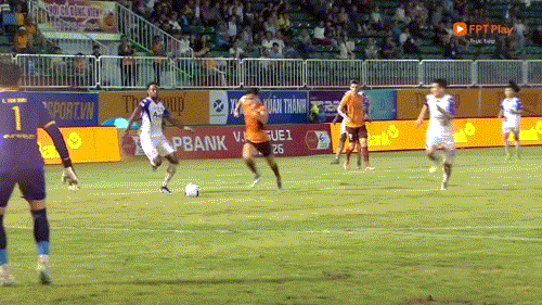 Phút 90+5: Trọng tài Mai Xuân Hùng xác định Văn Khánh đã phạm lỗi và phải nhận thẻ vàng, đồng thời HAGL được hưởng phạt đền.
