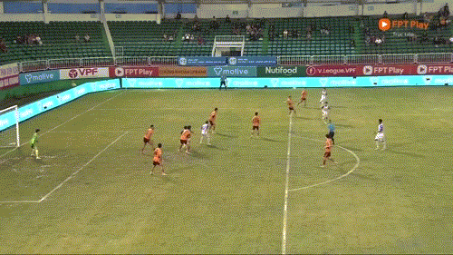 Phút 16: Từ ngoài vòng cấm, Vĩnh Nguyên đoạt bóng và quyết định dứt điểm ngay. Bóng đi rất thiếu chính xác.