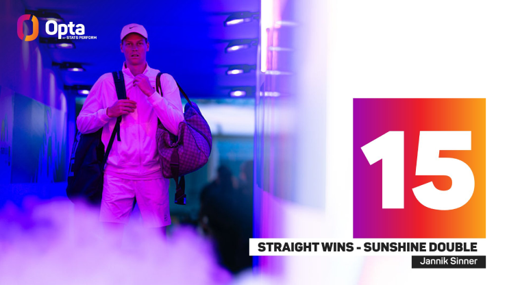 Đáng chú ý, kể từ năm 2000 đến nay, Sinner đã trở thành tay vợt thứ tư trong lịch sử giành được ít nhất 15 chiến thắng liên tiếp trong chuỗi giải "Sunshine Double" (bao gồm Indian Wells và Miami). Thành tích này giúp anh sánh ngang với những tượng đài vĩ đại nhất của môn thể thao này là Roger Federer, Novak Djokovic và Carlos Alcaraz.