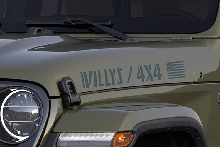 Gói Willys '41 còn có lớp decal dán trên nắp ca-pô cổ điển có dòng chữ "Willys/4x4" kèm hình ảnh lá cờ Mỹ. Tấm bảo vệ lưới tản nhiệt 3 vòng Mopar, bệ bước chân thép hai bên hông.