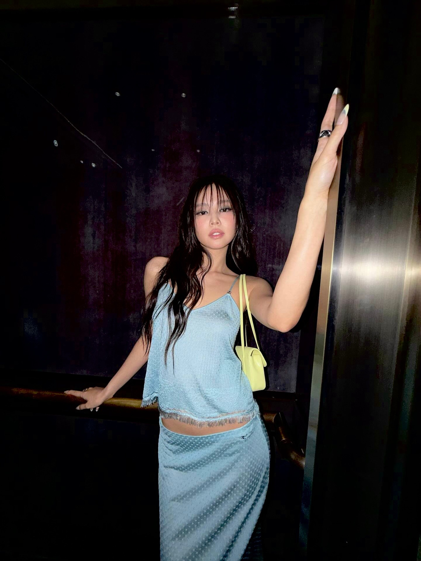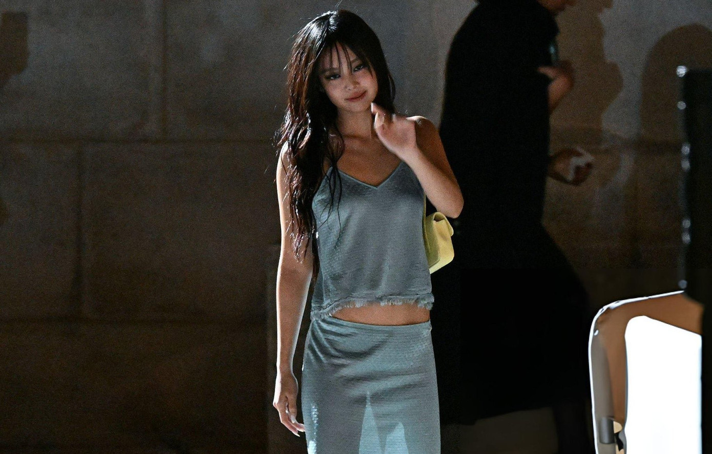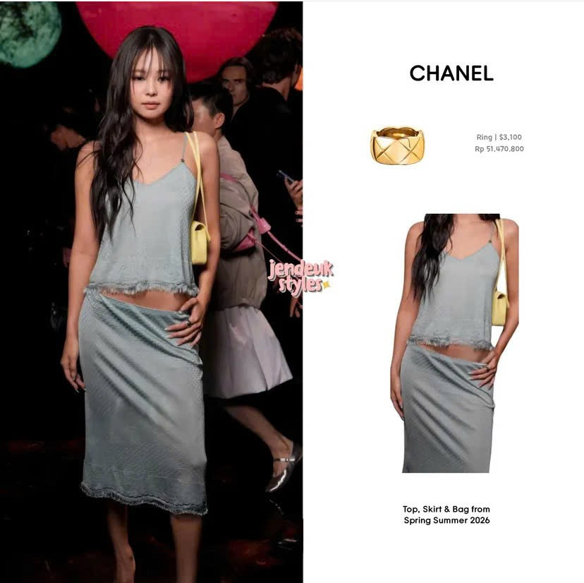 Rạng sáng 7/10 (giờ Việt Nam), chính thức xuất hiện tại tòa Grand Palais, nơi ra mắt bộ sưu tập Xuân Hè 2026 của nhà mốt Pháp. Tại sự kiện, cô diện bộ trang phục màu xanh ngọc gồm áo hai dây và chân váy đồng màu, điểm xuyết túi xách Chanel màu vàng chanh tạo điểm nhấn nổi bật. Thiết kế với chất liệu mỏng nhẹ, xuyên thấu lấy cảm hứng từ nội y, phá vỡ hình ảnh cổ điển truyền thống của Chanel.