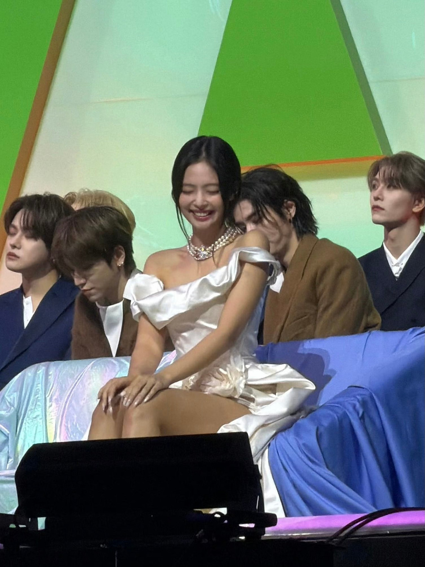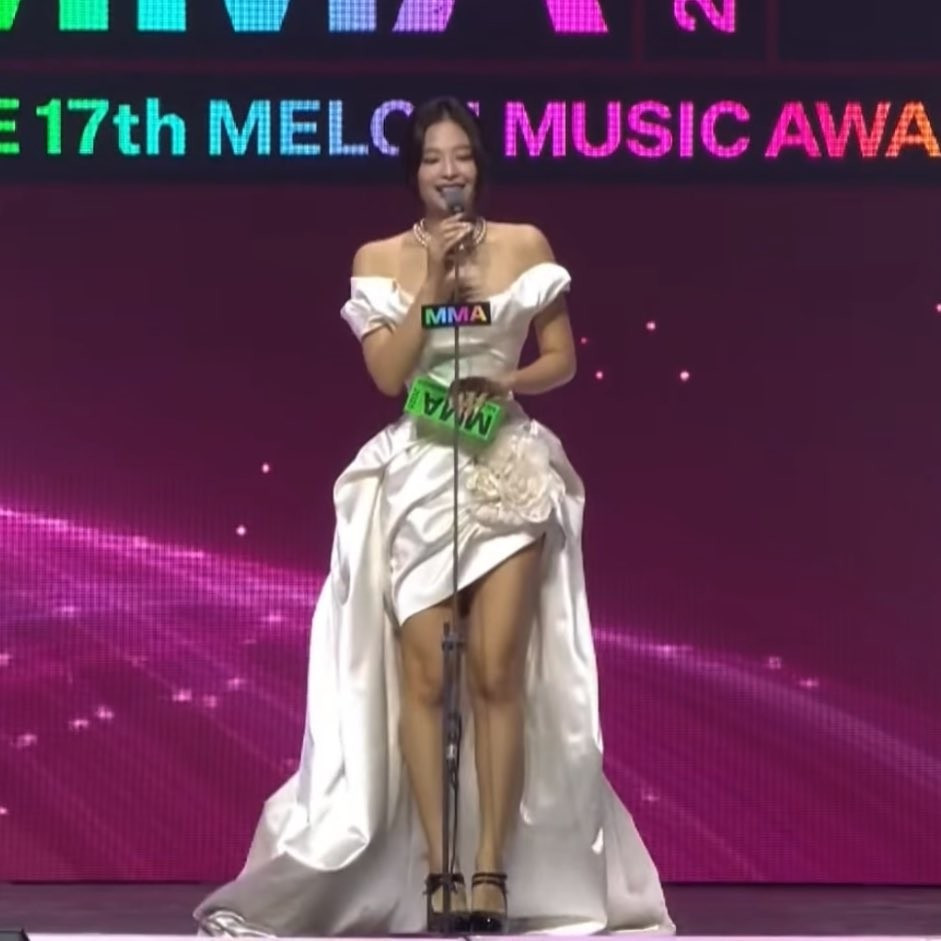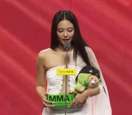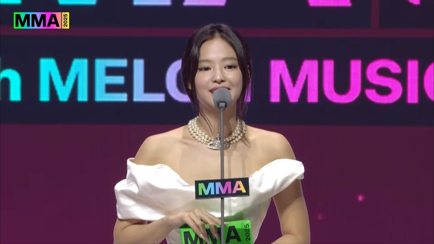 Jennie không chọn sắc đỏ đặc trưng của era RUBY mà đồng nhất trong tông trắng - đen khi trở lại MMA. Bộ cánh cuối cùng của cô khi lên nhận Daesang là bộ cánh trắng có cut-out táo bạo với điểm nhấn là lớp voan khoác nhẹ lên vai.