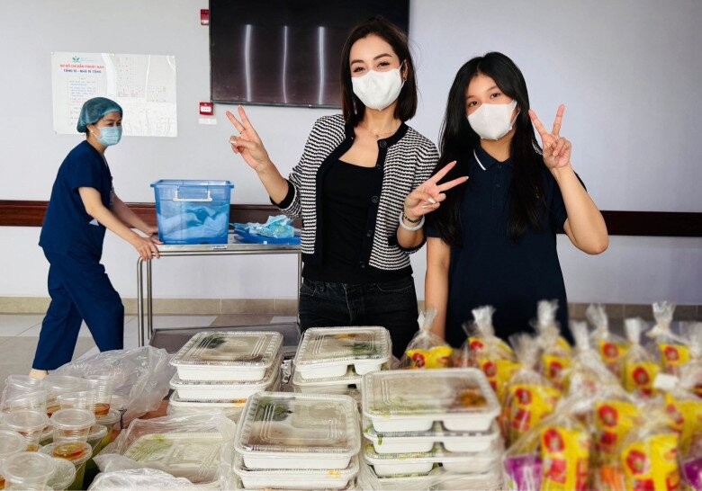 Jennifer Phạm và con gái tham gia phát quà cho các bệnh nhân ở Bệnh viện Nhi Trung ương hồi tháng 4/2025.