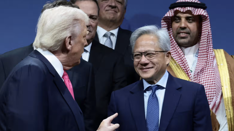 Tổng thống Mỹ Donald Trump và Giám đốc điều hành Nvidia Jensen Huang tại Diễn đàn đầu tư Mỹ-Ả Rập Xê Út ở Washington vào ngày 19 tháng 11. Ảnh: Nikkei Asia.