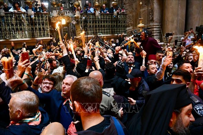 Ngọn lửa thiêng được thắp lên từ Nhà thờ Mộ Thánh. Ảnh: TTXVN phát