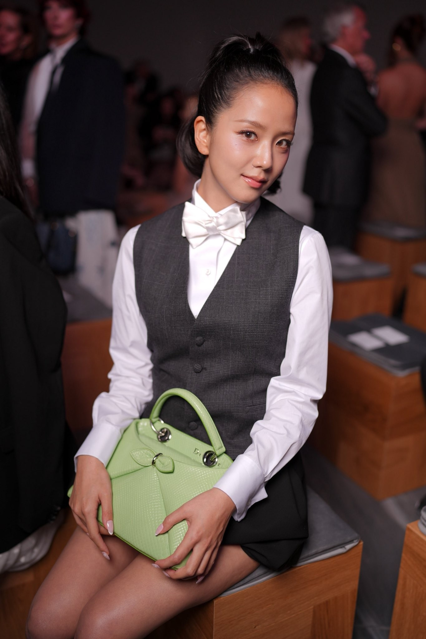 Tham dự show diễn ra mắt bộ sưu tập Dior Xuân Hè 2026 lần này, Jisoo lựa chọn áo gile kết hợp cùng sơ-mi dài tay với điểm nhấn là chiếc nơ trắng, phối cùng chân váy bí trendy màu đen. Mái tóc xoăn được buộc cao gọn gàng, khoe trọn gương mặt được ví như "Hoa hậu" của giới thần tượng.