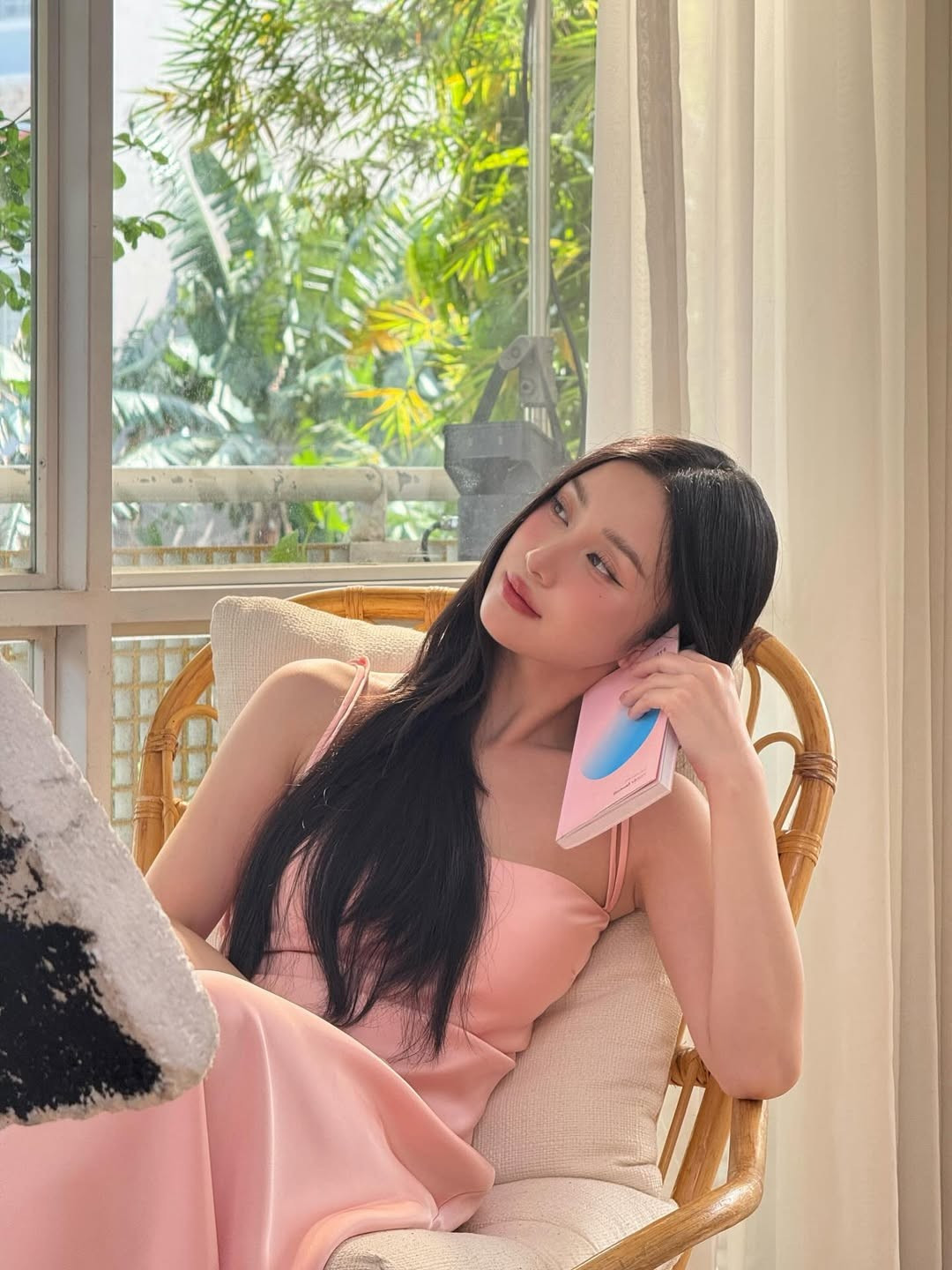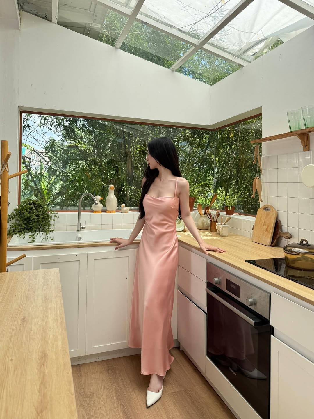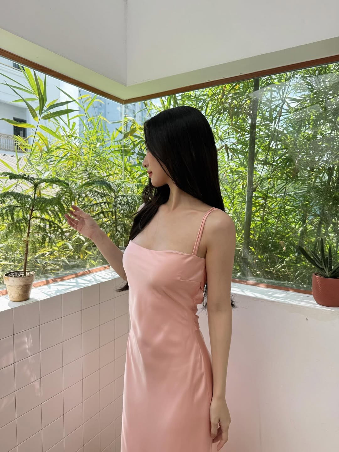 Trong loạt ảnh vừa chia sẻ, Jun Vũ xuất hiện trong một không gian tràn ngập ánh sáng tự nhiên và cây cỏ. Cô diện một chiếc váy lụa tông hồng pastel ngọt ngào, chất liệu satin bóng bẩy ôm sát những đường cong cơ thể một cách tinh tế. (Ảnh: IGNV)
