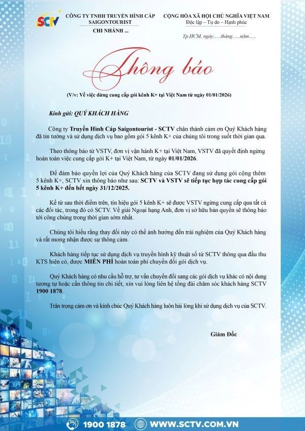 “Theo thông báo từ VSTV, đơn vị vận hành K+ tại Việt Nam, VSTV đã quyết định ngừng hoàn toàn việc cung cấp gói K+ từ 1.1.2026”, SCTV nêu.