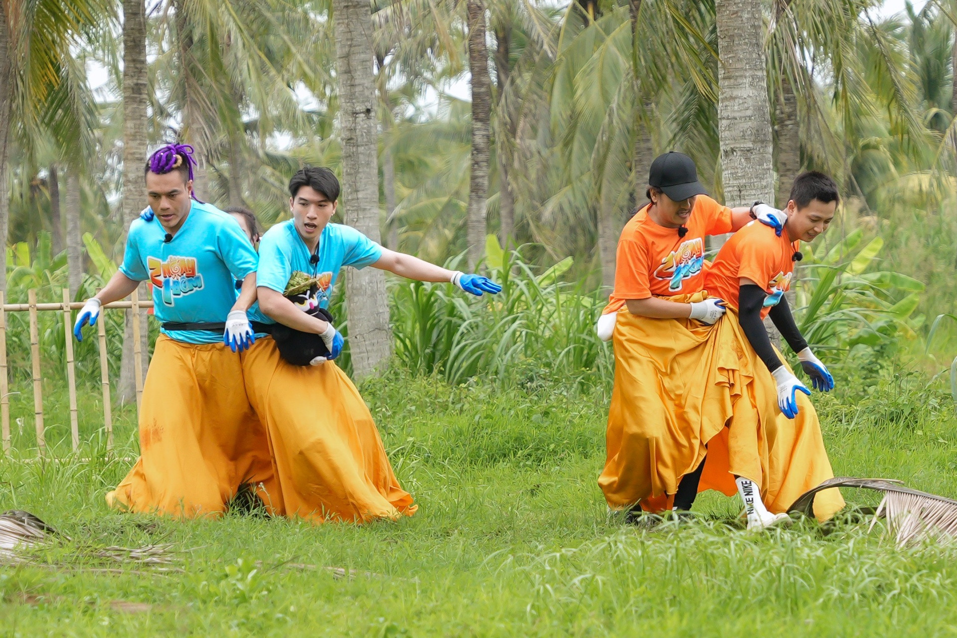 Thử thách liên hoàn cuối tập 83 đòi hỏi sự phối hợp nhịp nhàng, khi 3 thành viên phải mặc chung một chiếc váy to và di chuyển để vặt lá dừa, hái dừa.