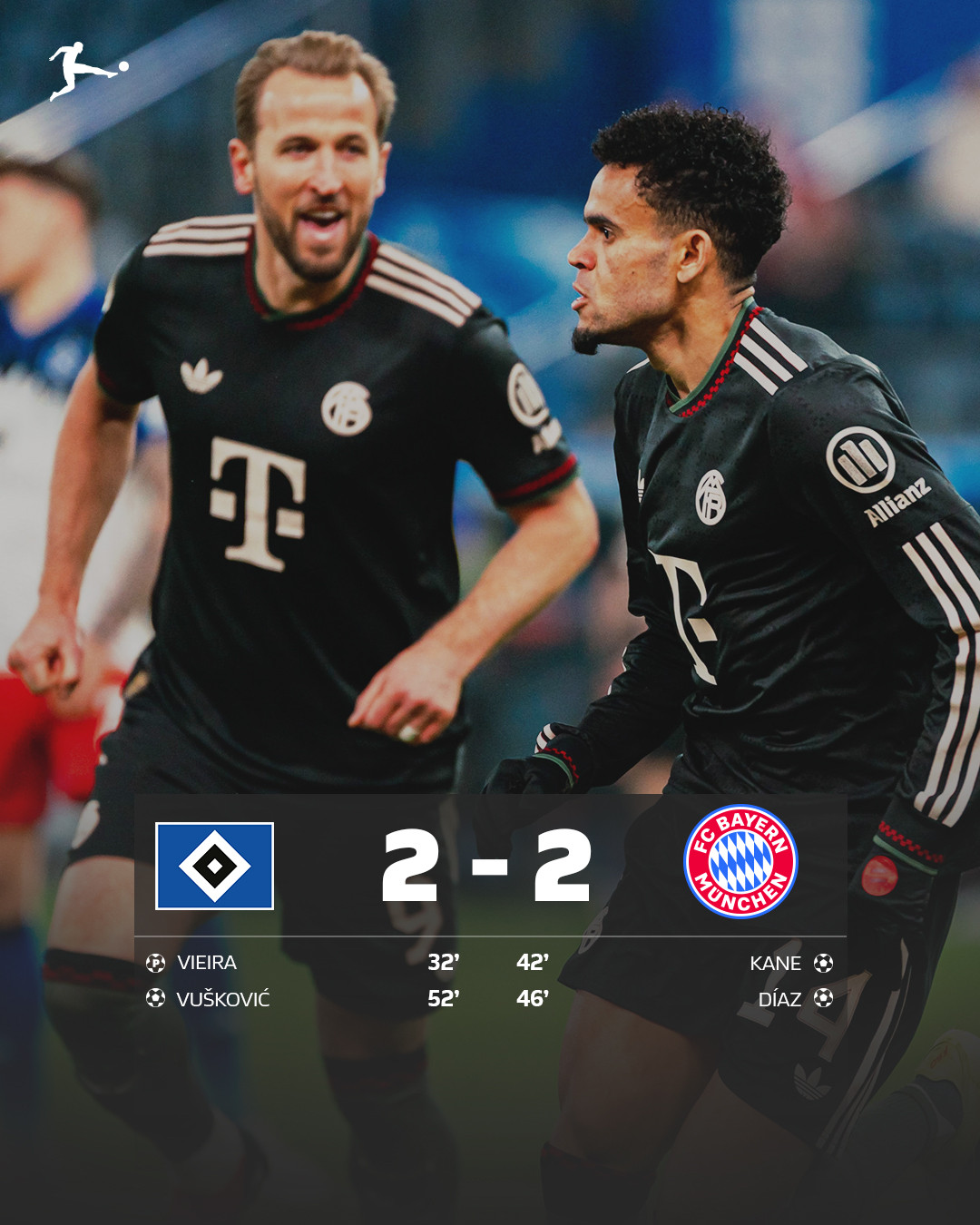 Tuy nhiên, Hamburger tiếp tục cho thấy sự lì lợm khi Vuskovic đánh đầu gỡ hòa 2-2. Những phút cuối, Bayern dồn ép mạnh mẽ nhưng không thể tìm thêm bàn thắng.