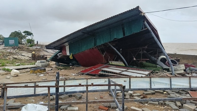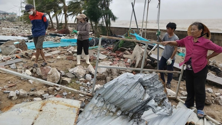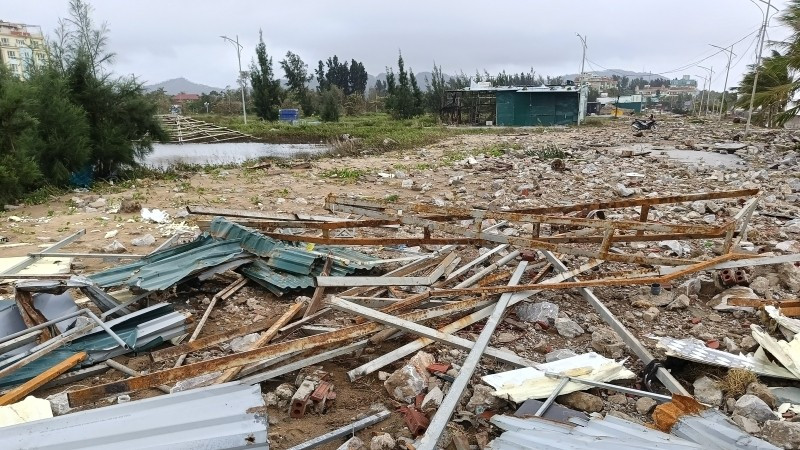 Trên con đường ven biển, trời mưa lất phất kèm gió mạnh, nhưng từng nhóm người dân vẫn đang từ trong đống đổ nát cố nhặt nhạnh những gì còn dùng được. Ông Lê Văn Chinh, 68 tuổi, tay cầm mảnh tôn vỡ, giọng ngắt quãng: "Đang ốm mà nhà chẳng còn ai làm, nên buộc phải ra đây. Một năm mấy trận như thế này, sức nào chịu nổi".