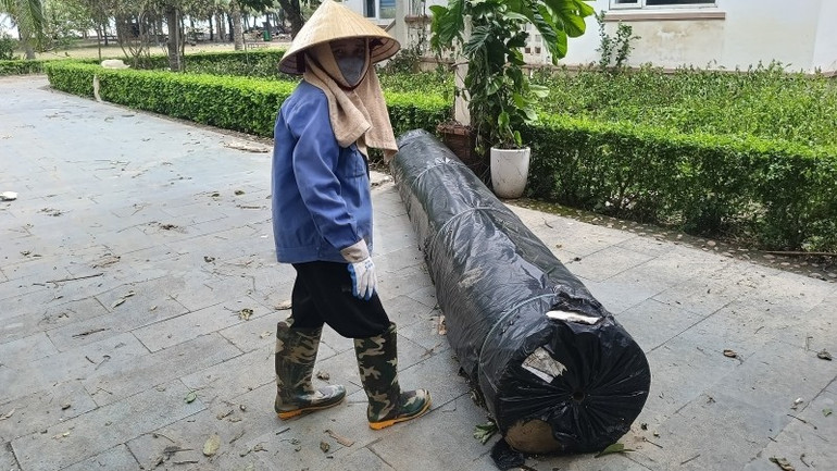 Chị Đào bên cạnh cuộn bạt bị nước đưa từ ngoài vào trong khu nghỉ dưỡng.