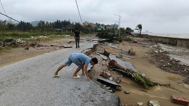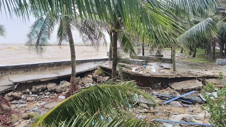 Ông Nguyễn Văn Phương, chủ một khách sạn, đứng lặng nhìn bờ kè sụt lún. Ông chia sẻ: "Vài năm trước, khu này cũng bị bão làm hư hại, nhưng đợt này tan nát hơn nhiều. Thiên nhiên khắc nghiệt quá, giờ không biết phải xây kè thế nào mới chịu nổi bão nữa".
