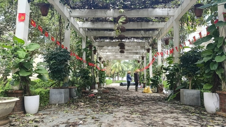Bên trong khuôn viên Hải Tiến Resort, tiểu cảnh và cây cối tan hoang, bùn đất phủ kín những con đường nội khu. Hai chị lao công cần mẫn dọn từng viên gạch, từng cành cây.