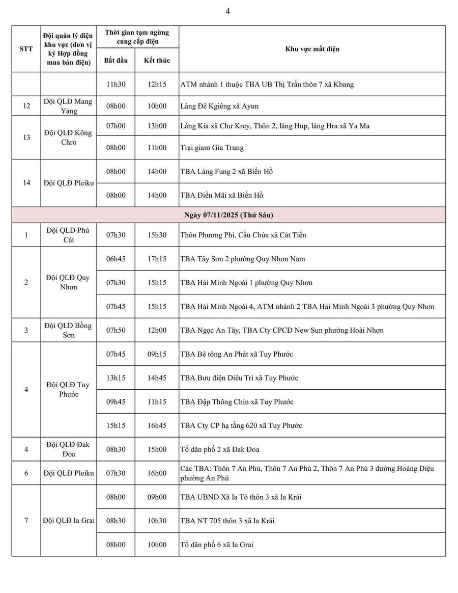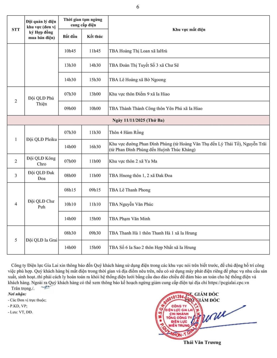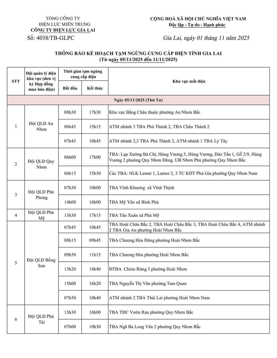 Kế hoạch tạm ngừng cung cấp điện tỉnh Gia Lai