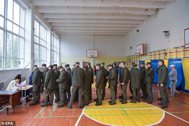 Các binh sĩ Ukraine xếp hàng chờ nhận phiếu bầu tại một điểm bỏ phiếu trong cuộc bầu cử tổng thống Ukraine vòng 2 ở thành phố miền tây Lviv tháng 4/2019. Ảnh: EPA