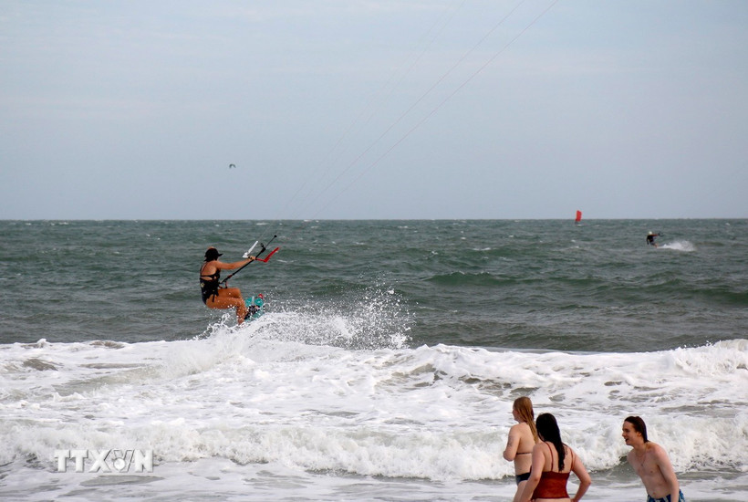 Sóng mạnh, gió lớn của biển Mũi Né (Lâm Đồng) luôn tạo được cảm giác mạnh, thích thú cho du khách chơi lướt ván diều. (Ảnh: Nguyễn Thanh/TTXVN)