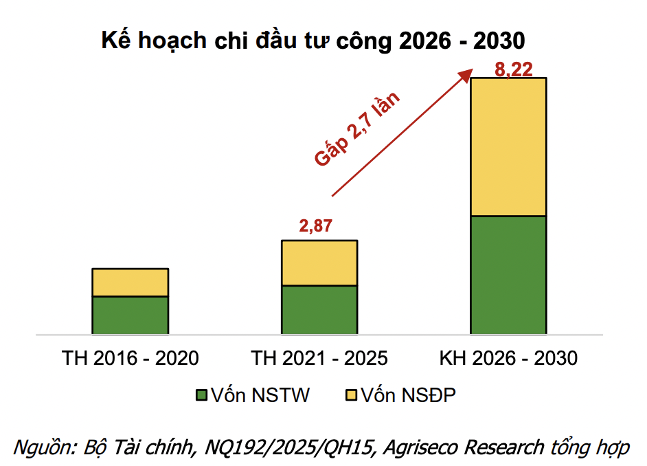 Trên thị trường chứng khoán, cổ phiếu đầu tư công cũng đã có những nhịp hồi rất tốt kể từ đầu năm 2026 đến nay. Mặc dù vậy, theo nhận định của Chứng khoán Agriseco, nhóm này còn có khả năng bứt tốc nữa trong thời gian tới.