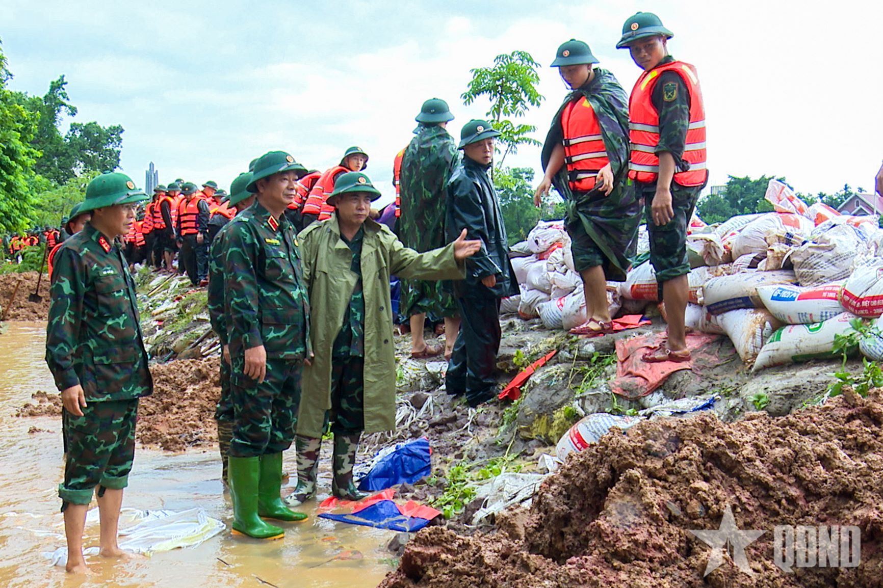 Lãnh đạo Quân khu 1 kiểm tra, chỉ đạo các đơn vị gia cố đê sông Cầu trên địa bàn tỉnh Thái Nguyên. Ảnh: HOÀNG DƯƠNG
