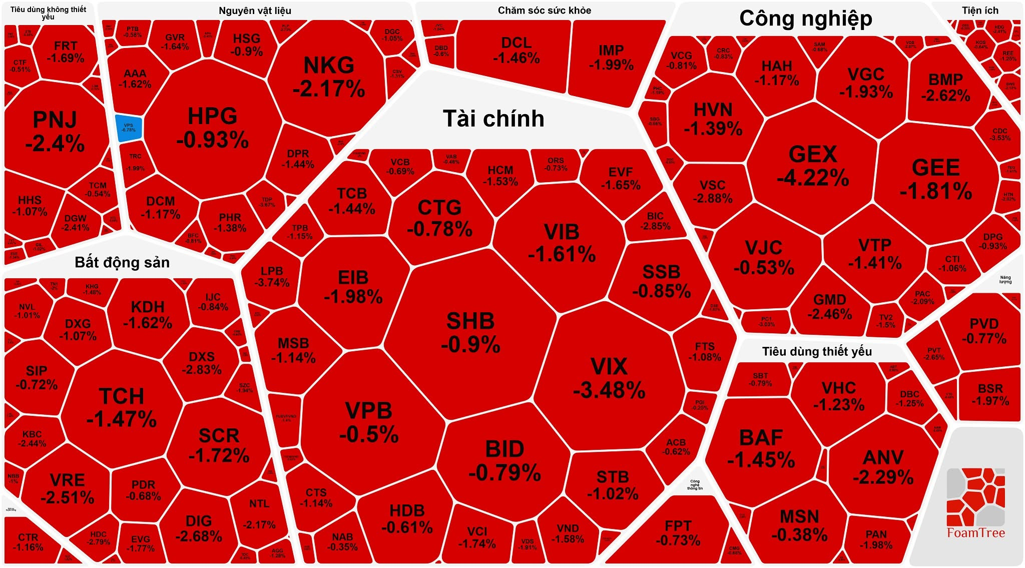 Trong khi đó, hầu hết các nhóm ngành chính đều giảm điểm. Nhóm cổ phiếu tài chính (ngân hàng - chứng khoán) chìm trong sắc đỏ: LPB giảm 2,74%, EIB giảm 1,98%, VIB giảm 1,61%, STB giảm 1,02%, TCB giảm 1,44%, MSB giảm 1,14%, TPB giảm 1,15%; VIX giảm 2,48%, SHS giảm 2,78%, VND giảm 1,58%, HCM giảm 1,53%, VCI giảm 1,74%...