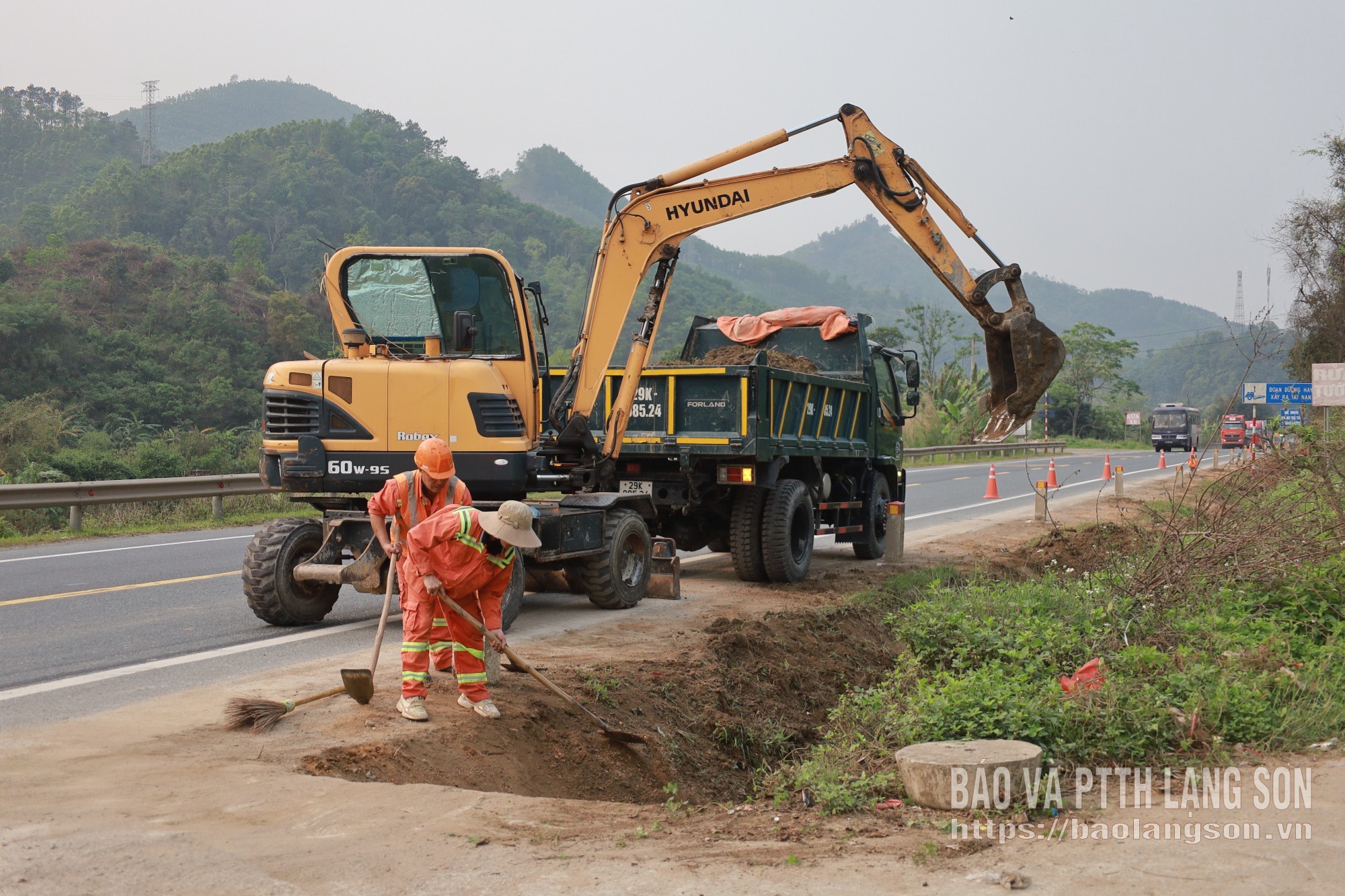 Công nhân đơn vị vận hành tuyến quốc lộ 1 nạo, vét bùn đất 2 bên đường, đảm bảo an toàn giao thông trên tuyến