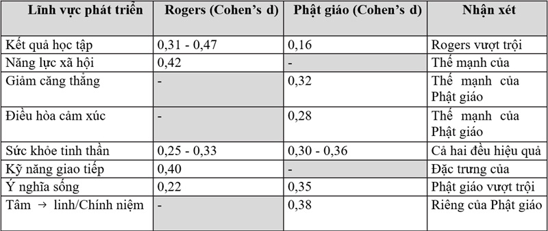 Bảng 1. So sánh mức độ tác động (Cohen’s d) giữa Rogers và Phật giáo
