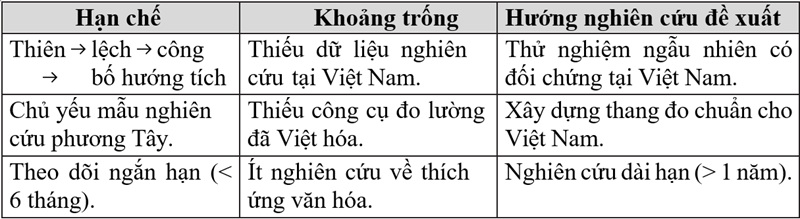 Những khoảng trống nghiên cứu quan trọng bao gồm thiếu công cụ đã được xác thực cho nhiều khái niệm trong bối cảnh Việt Nam, các nghiên cứu theo dõi dài hạn hạn chế (phần lớn < 6 tháng), và không có nghiên cứu có hệ thống về các quy trình thích ứng văn hóa.