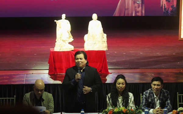 Đại diện Hội đồng họ Trần Việt Nam trao tặng các tác phẩm tranh, tượng vua Trần Nhân Tông để đấu giá trong ngày công diễn tác phẩm "Trần Nhân Tông.