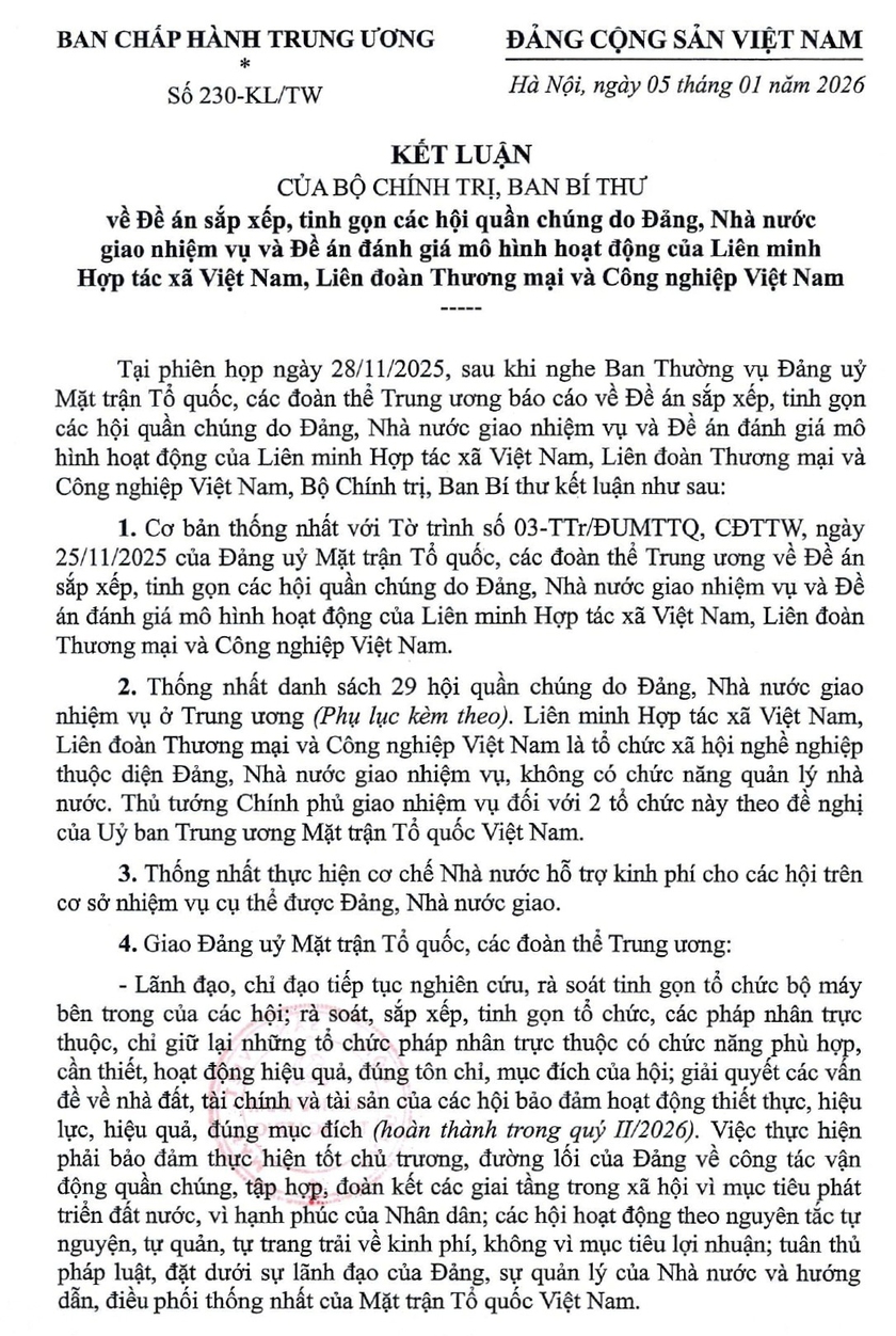 Toàn văn Kết luận của Bộ Chính trị, Ban Bí thư về Đề án sắp xếp, tinh gọn các hội quần chúng do Đảng, Nhà nước giao nhiệm vụ và Đề án đánh giá mô hình hoạt động của Liên minh Hợp tác xã Việt Nam, Liên đoàn Thương mại và Công nghiệp Việt Nam
