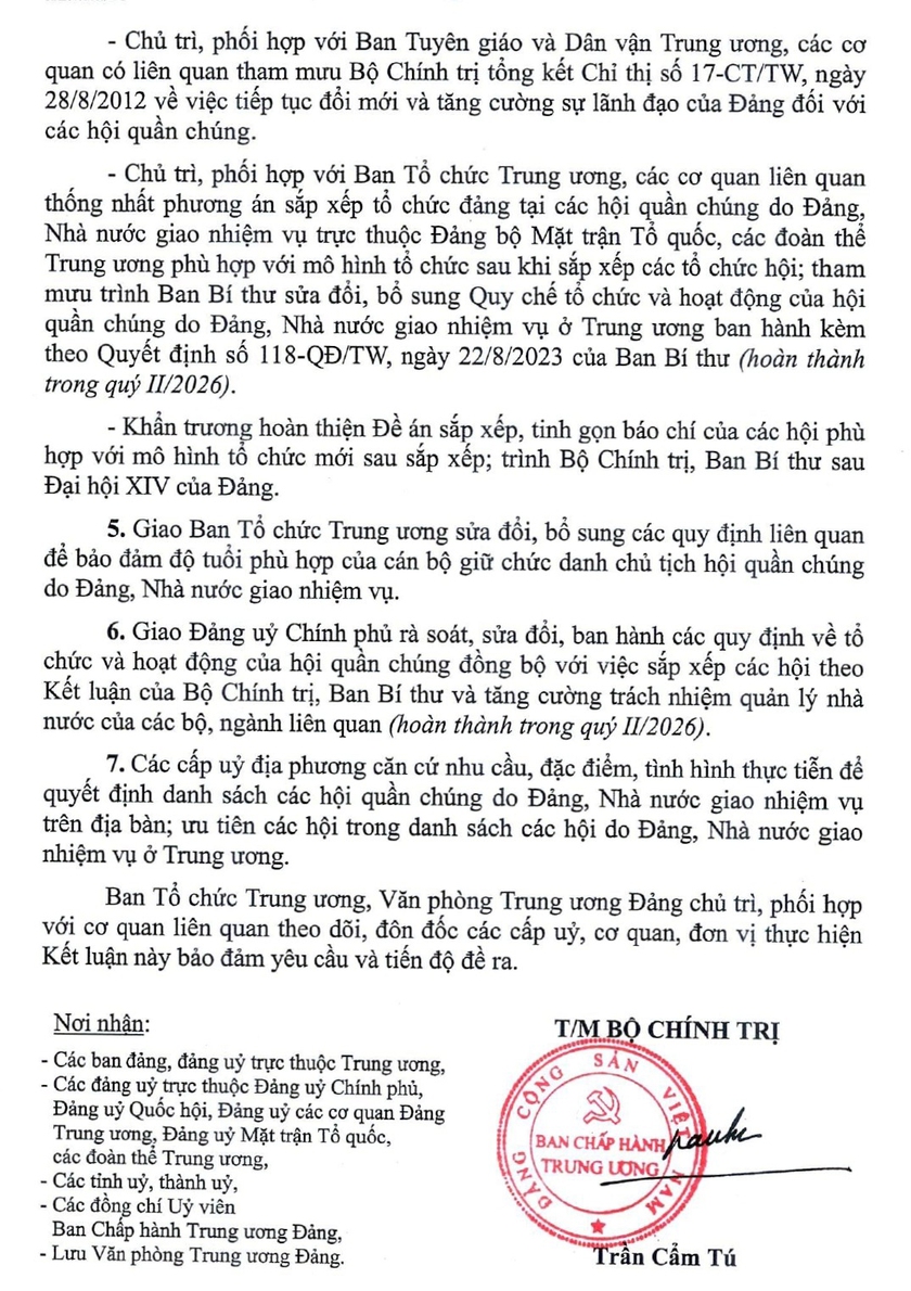 Với các cấp ủy địa phương, Bộ Chính trị, Ban Bí thư yêu cầu căn cứ nhu cầu, đặc điểm, tình hình thực tiễn để quyết định danh sách các hội quần chúng do Đảng, Nhà nước giao nhiệm vụ trên địa bàn. Trong đó, ưu tiên các hội do Đảng, Nhà nước giao nhiệm vụ ở Trung ương.